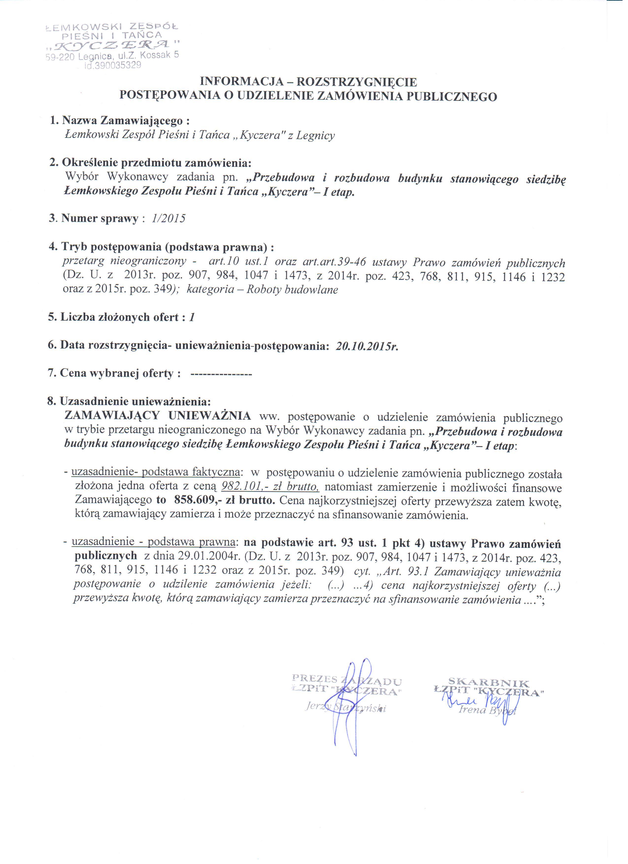 Zamawiający unieważnia postepowanie o udzielenie zamówienia publicznego w trybie przetargu nieograniczonegona Wybór Wykonawcy zadania pn. „Przebudowa i rozbudowa budynku stanowiącego siedzibę Łemkowskiego Zespołu Pieśni i Tańca „Kyczera”– I etap" z powodu przekroczenia możliwości finansowych Zamawiającego.